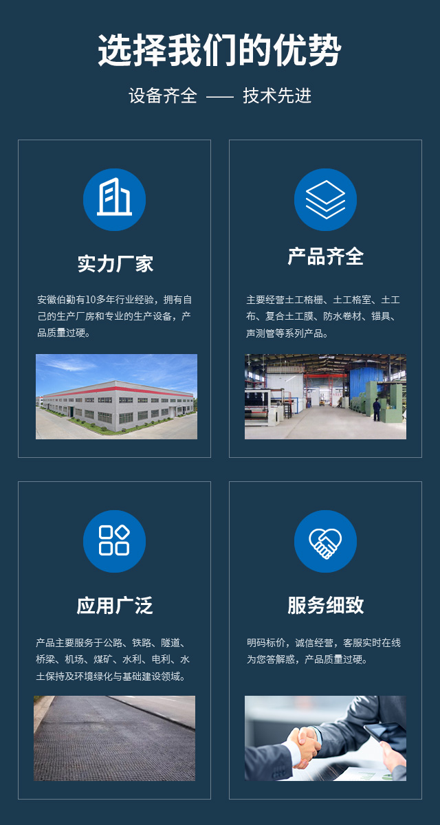 安徽伯勤工程材料集团有限公司位于中国安徽省省会合肥,公司主要经营玻璃纤维土工格栅、经编涤纶土工格栅、钢塑土工格栅、塑料土工格栅、土工格室、土工布、复合土工膜、防水卷材、锚具、声测管等系列产品,产品主要服务于公路、铁路、隧道、桥梁、机场、煤矿...